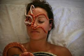 Σύμφωνα με τους ειδικούς, το βάρος και η κίνηση των φιδιών που γλιστρούν νωχελικά πάνω στις πλάτες και τα πόδια των πελατών αλλά και η αδρεναλίνη που απελευθερώνει το σώμα λόγω του φόβου, έχουν ευεργετικά αποτελέσματα για την υγεία.