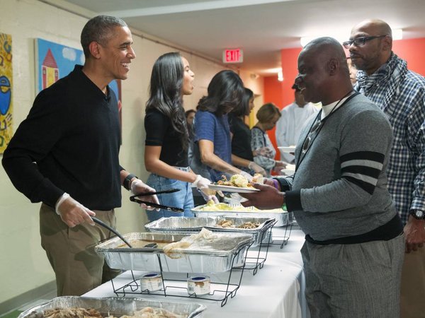 Ημέρα των ευχαριστιών η 26η Νοεμβρίου και την παραμονή της, λίγες ώρες πριν, όπως κάθε χρόνο ο Αμερικανός πρόεδρος Μπάρακ Ομπάμα μαζί με τη σύζυγο του Μισέλ και τις κόρες του Μάλια και Σάσα σερβίρει το γεύμα της αγάπης στους άστεγους.