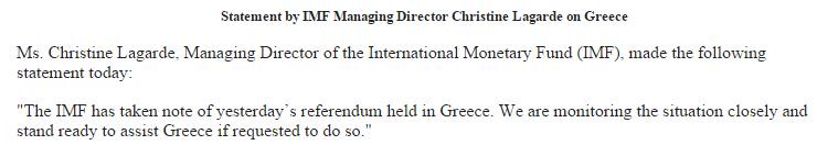 «Το ΔΝΤ έλαβε υπόψη του το αποτέλεσμα του δημοψηφίσματος που έγινε στην Ελλάδα. Παρακολουθούμε την κατάσταση στενά και είμαστε σε ετοιμότητα να βοηθήσουμε την Ελλάδα αν μας ζητηθεί να το κάνουμε», ανέφερε η δήλωση της κ. Λαγκάρντ που δόθηκε στη δημοσιότητα.