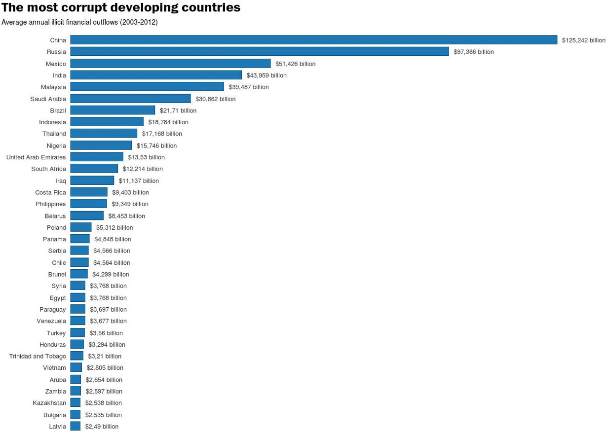 Η Κίνα είναι επικεφαλής, συνεισφέροντας με σχεδόν 250 δισεκατομμύρια δολάρια σε παράνομες χρηματοοικονομικές ροές το 2012, καθώς μέχρι εκείνη τη χρονιά είναι διαθέσιμα τα δεδομένα. Η Ρωσία ακολουθεί με παράνομες εκροές ύψους 125 δισεκατομμυρίων, ενώ η Ινδία, η τρίτη πιο διεφθαρμένη χώρα στον κόσμο, ακολουθεί με 100 δισ. συνεισφορά στον παγκόσμιο «κουμπαρά» του μαύρου χρήματος.