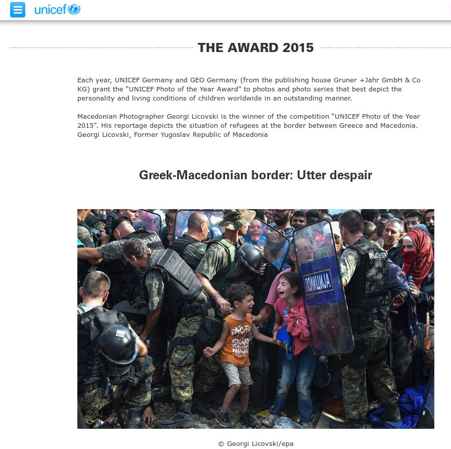 «Ηταν 21 Αυγούστου του 2015 στα σύνορα Ελλάδας-Μακεδονίας, που συνέβη αυτή η δραματική κατάσταση σε δύο προσφυγόπουλα και συνέλαβε ο φακός του φωτογράφου» γράφει στην επίσημη ιστοσελίδα της η Unicef.
