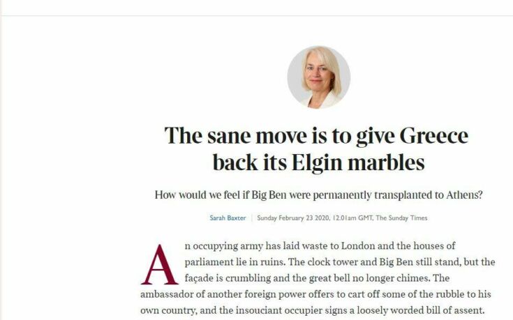 Υπέρ της επιστροφής των γλυπτών του Παρθενώνα στην Ελλάδα, τάσσεται σε άρθρο γνώμης η συντάκτρια των Sunday Times, Σάρα Μπάξτερ.