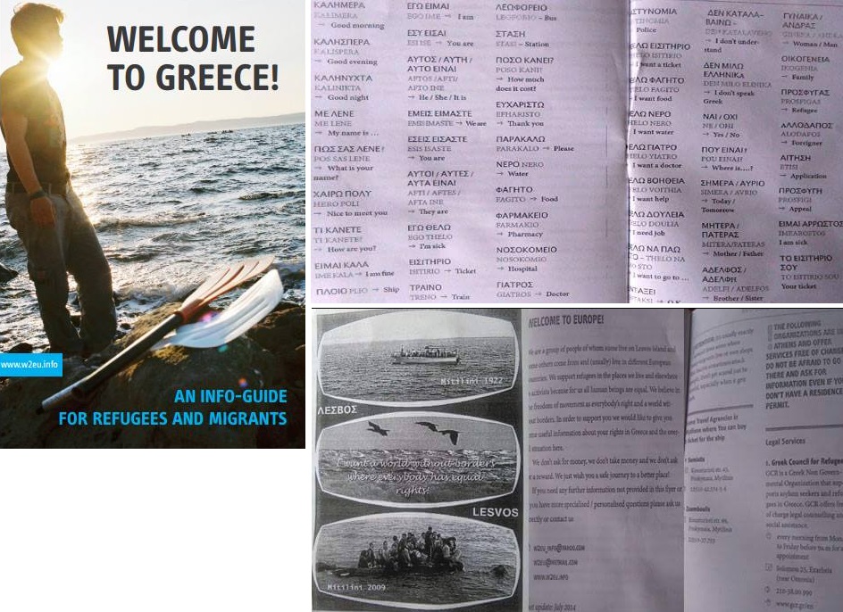 Στο εσωτερικό του φυλλαδίου υπάρχει ενημέρωση, όπως και φράσεις στα ελληνικά με εξήγηση στα αγγλικά, ώστε οι πρόσφυγες – λαθρομετανάστες να μπορούν να πουν δυο λέξεις αλλά και να έχουν ένα μπούσουλα πώς θα κινηθούν.
