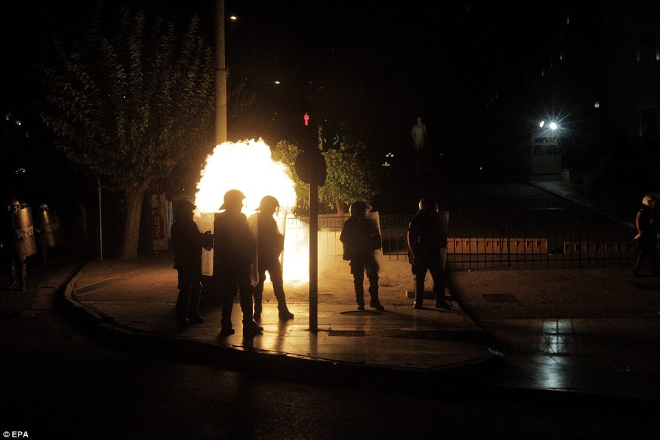 Η βρετανική εφημερίδα όμως επικεντρώνει και στα επεισόδια που έλαβαν χώρα χθες έξω από τη Βουλή δημοσιεύοντας φωτογραφίες από τις επιθέσεις με βόμβες μολότοφ που έγιναν κατά των αστυνομικών δυνάμεων. Οι διαδηλωτές αντιτίθενται στην λιτότητα και τις μεταρρυθμίσεις που επιβάλλονται από τους δανειστές και οι οποίες θα οδηγήσουν σε χρηματοδότηση μέσω ενός νέου πακέτου βοήθειας, ενημερώνει η Daily Mail.