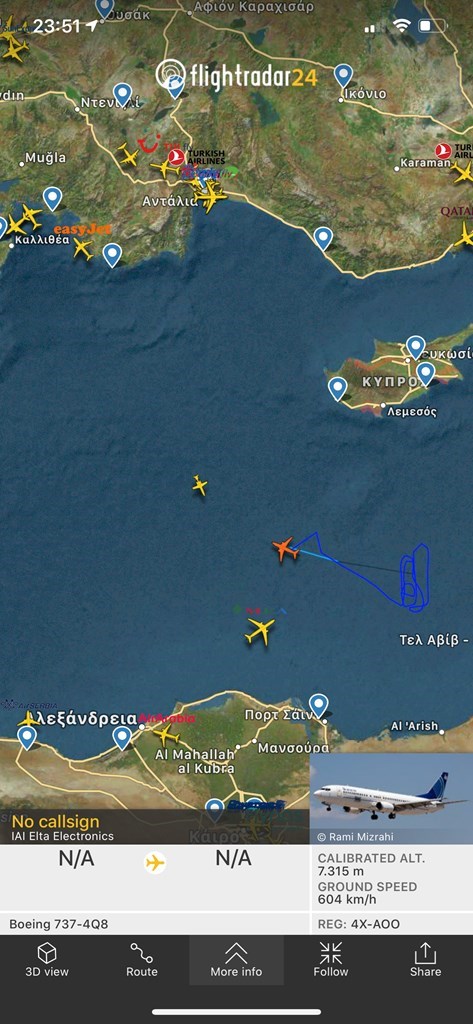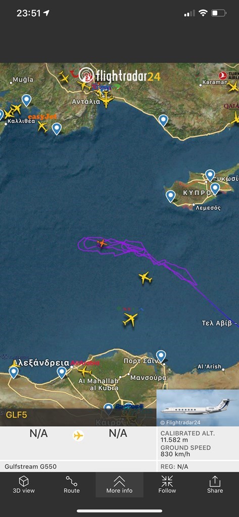 Εντύπωση προκαλεί ο χάρτης εναέριας κυκλοφορίας που αποτυπώνει την κίνηση αεροσκαφών στην περιοχή της Ανατολικής Μεσογείου, που δείχνει ένα αεροπλάνο που προέρχεται από το Ισραήλ και συγκεκριμένα κάπου από την περιοχή του Τελ Αβίβ και πετάει πολύ κοντά στο σημείο όπου διεξάγει έρευνες το Oruc Reis.