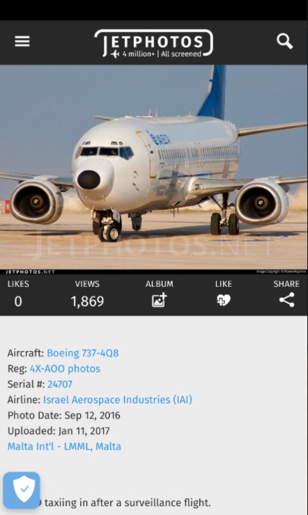 Όπως αποδεικνύεται από βάση δεδομένων όπου περιέχονται όλα τα αεροσκάφη του κόσμου, πρόκειται για ισραηλινό αεροπλάνο της IAI Elta Electronics τύπου Boeing 737-4Q8 πιθανότατα διαμορφωμένο σε ιπτάμενο ραντάρ.