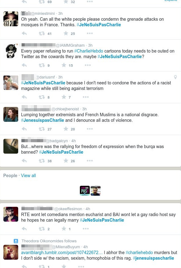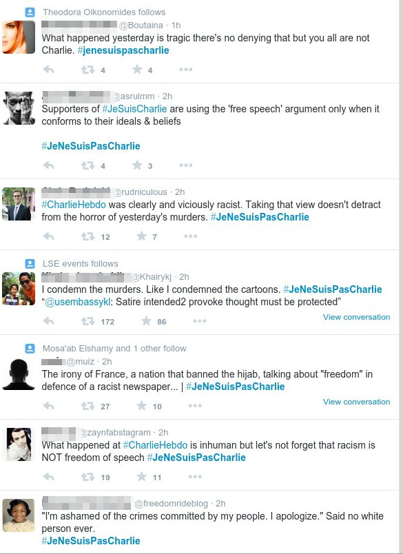 Οι χρήστες των social media που υπογράφουν με αυτό το hashtag καταδικάζουν όλοι τη δολοφονική επίθεση, ωστόσο, χαρακτηρίζουν το περιοδικό Charlie Hebdo ρατσιστικό και κρατούν αποστάσεις από τα σκίτσα που δημοσίευε θεωρώντας τα προσβλητικά.