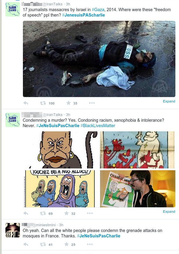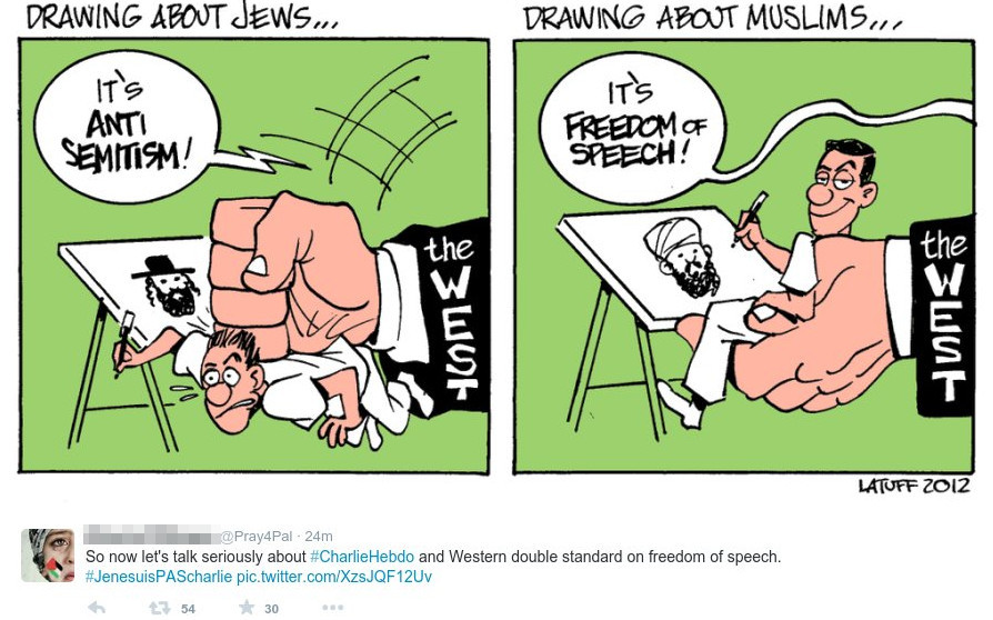 Αλλοι χρήστες επικρίνουν τη Γαλλία σημειώνοντας ότι μιλούν για ελευθερία του λόγου στη χώρα που απαγόρευσαν τη μαντίλα ή που συνέλαβαν όσους πραγματοποιούσαν διαδηλώσεις αλληλεγγύης στην Παλαιστίνη.