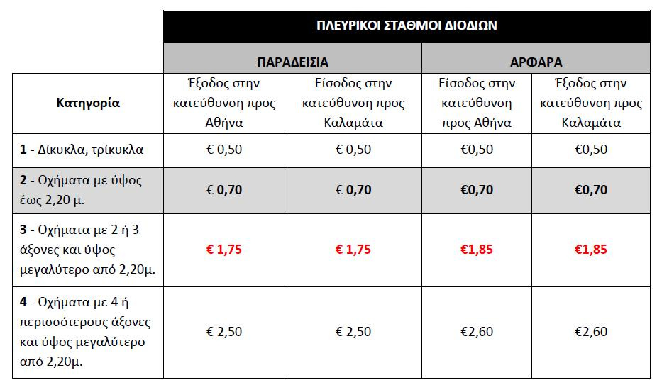 Μειώσεις επέρχονται και σε ορισμένους πλευρικούς σταθμούς για ορισμένες κατηγορίες οχημάτων.
