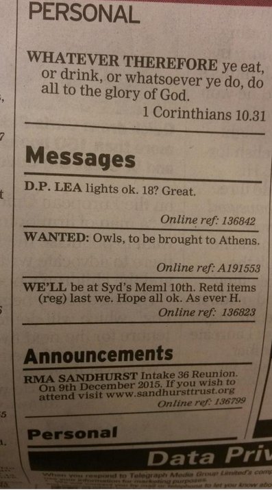 Ολοι προσπαθούν να καταλάβουν ποιός και για ποιόν σκοπό έβαλε την ανακοίνωση, ενώ δεν είναι λίγοι αυτοί που «βλέπουν»… κωδικοποιημένα μηνύματα μεταξύ κατασκόπων πίσω από την αγγελία! Μάλιστα την αναπαρήγαγε ακόμη και ο Guardian, που αναρωτιέται αν κρύβεται κάποιος Ελληνας πίσω από τη δημοσίευση.