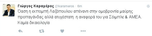 Ο Αντιπεριφερειάρχης Βορείου Τομέα Αττικής μέσω του Twitter εξήρε την εκπομπή του, αλλά για την αναφορά για τον Σόιμπλε και τα ΑΜΕΑ τόνισε ότι δεν υπάρχει καμία δικαιολογία εκ μέρους του Λαζόπουλου.