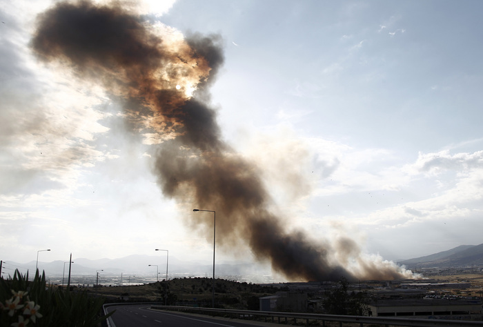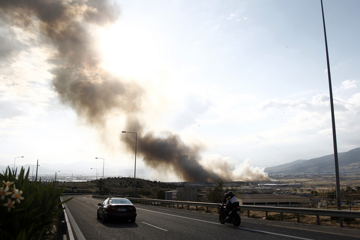 Η φωτιά ξέσπασε στις 13.30 σε ξερά χόρτα, όμως στη συνέχεια επεκτάθηκε στο εργοστάσιο όπου καίγονται μεγάλες ποσότητες πλαστικών και χαρτιών.