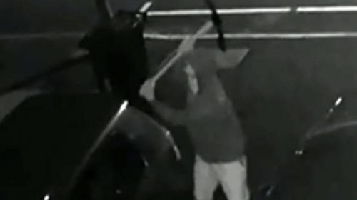 Η κάμερα ασφαλείας μιας οικίας κατέγραψε τη στιγμή που ένας κουκουλοφόρος κινείται γρήγορα και αθόρυβα προς ένα σταθμευμένο αμάξι, πριν προσγειώσει το σκαπτικό εργαλείο του στον ουρανό του αυτοκινήτου.