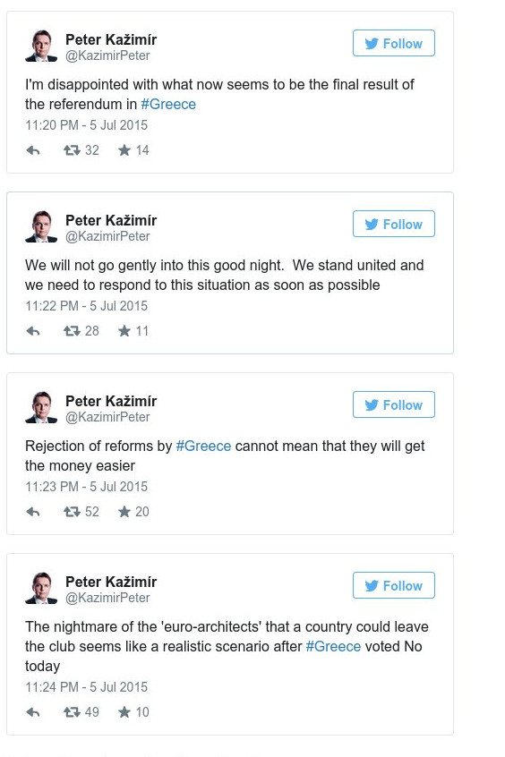 Με απανωτά tweet στον προσωπικό του λογαριασμό, ο ΥΠΟΙΚ της Σλοβακίας, Πίτερ Κάζιμιρ, έδειξε με κάθε τρόπο την αντίθεσή του με το αποτέλεσμα του δημοψηφίσματος.