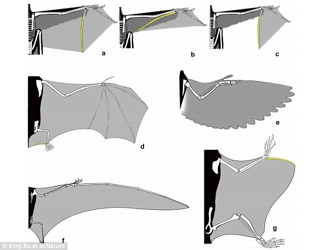 Το διάγραμμα παραπάνω δείχνει την φτερούγα του Γι τσι (a) σε σχέση με άλλα φτερωτά τετράποδα (b και c), τις φτερούγες της νυχτερίδας (d), του περιστεριού (e), του πτερόσαυρου (f), και ενός ιαπωνικού ιπτάμενου σκίουρου (g)