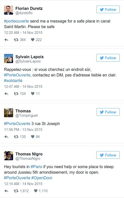 Με το hashtag #PorteOuverte, που σημαίνει «Πόρτες Ανοικτές» οι Γάλλοι καλούν όλους όσοι είναι στους δρόμους, να χτυπήσουν την πόρτα οποιουδήποτε σπιτιού για να βρουν καταφύγιο, μετά τις πολλαπλές τρομοκρατικές επιθέσεις. Την ίδια στιγμή οδηγοί ταξί πηγαίνουν πολίτες στα σπίτια τους δωρεάν.