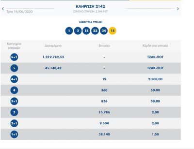 1, 3, 18, 22, 34 και Τζόκερ: 18.