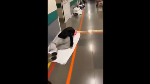 Ένας διάδρομος γεμάτος ασθενείς να περιμένουν, κάποιοι από αυτούς ξαπλωμένοι στο πάτωμα.