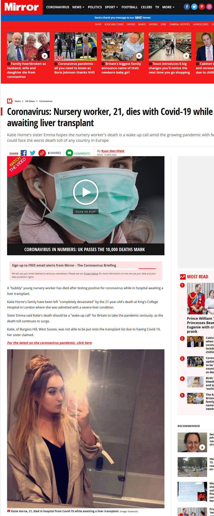 Όπως γράφει η εφημερίδα Mirror, η αδελφή της Katie Emma ζητά ο θάνατός της να είναι το σημάδι αφύπνισης για τη Βρετανία, ώστε να πάρει στα σοβαρά το θέμα του κορονοϊού, καθώς ο απολογισμός των νεκρών εξακολουθεί να μεγαλώνει.