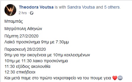 Όπως ενημέρωση η κόρη του, Θεοδώρα Βουτσά, η σορός του εκλιπόντος θα τεθεί σε λαϊκό προσκύνημα την Πέμπτη 27/2, από τις 9.00 το πρωί μέχρι τις 19.30 το απόγευμα.