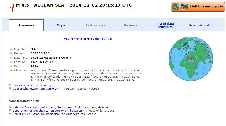 Σύμφωνα πάντως με το Ευρωμεσογειακό Σεισμολογικό Κέντρο ο σεισμός ήταν μεγάθους 4,5 R και το εστιακό του βάθος τα 10 χιλιόμετρα.