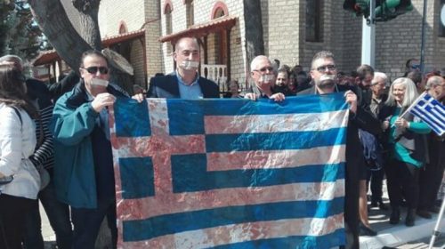 Εμφανίστηκαν πριν την έναρξη της παρέλασης, για την επέτειο της 25ης Μαρτίου, κρατώντας τη ματωμένη σημαία, από τα επεισόδια με την αστυνομία τον περασμένο μήνα, κατά την επίσκεψη της υπουργού Προστασίας του Πολίτη, Όλγας Γεροβασίλη, έχοντας κλείσει και τα στόματά τους με ταινία.