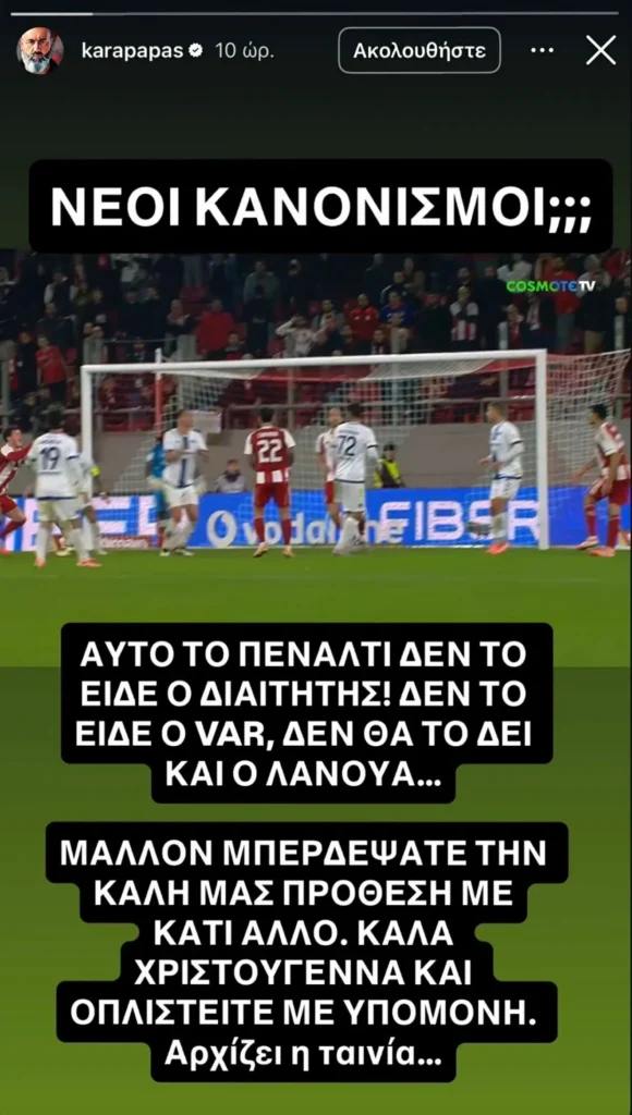 Ο Κώστας Καραπαπάς δεν άφησε τα πράγματα να πέσουν κάτω. Ο Αντιπρόεδρος της ΠΑΕ Ολυμπιακός πήρε θέση με ένα μήνυμα που συζητιέται ήδη έντονα, βάζοντας στο στόχαστρο τόσο τον διαιτητή και το VAR, όσο και τον αρχιδιαιτητή Λανουά.