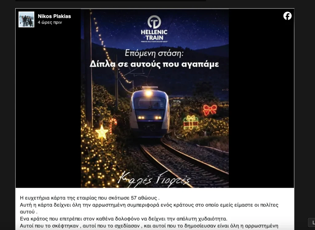 Κάποιες φορές πραγματικά αναρωτιέσαι αν υπάρχει ίχνος ενσυναίσθησης σε αυτόν τον τόπο. Η Hellenic Train αποφάσισε να στείλει ευχές για «Καλά Χριστούγεννα» στο επιβατικό κοινό και, όπως ήταν αναμενόμενο, η κίνηση αυτή προκάλεσε την οργή των ανθρώπων που πλήρωσαν το βαρύτερο τίμημα στα Τέμπη.