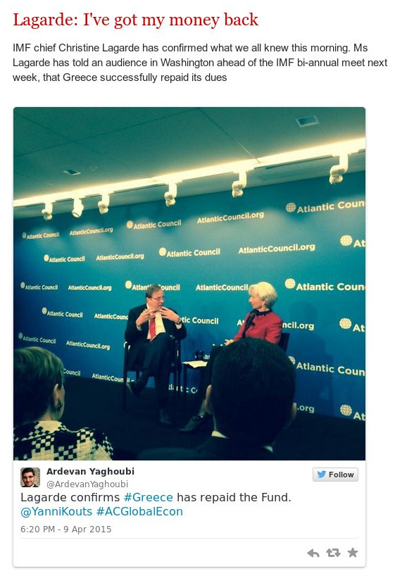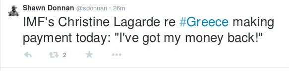 Μάλιστα, την ίδια ατάκα έγραψε στο Twitter και ο δημοσιογράφος των Financial Times Σον Ντόναν αναφέροντας Η Κριστίν Λαγκάρντ του ΔΝΤ για την πληρωμή δόσης σήμερα: Πήρα τα λεφτά μου πίσω!