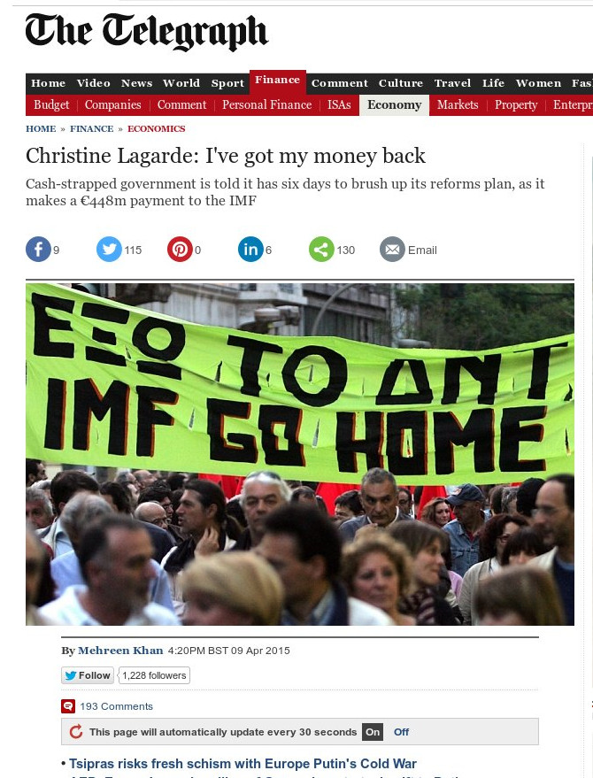 Η Γενική Διευθύντρια του Διεθνούς Νομισματικού Ταμείου σε εκδήλωση στην Ουάσινγκτον τόνισε, όπως μεταδίδει και η «Telegraph» στην ζωντανή μετάδοση των εξελίξεων για το ελληνικό ζήτημα, ότι «Πήρα τα λεφτά μου πίσω», επιβεβαιώνοντας έτσι αυτό που είχε διαρρεύσει από το πρωί ότι η Ελλάδα πλήρωσε την δόση στο ΔΝΤ.