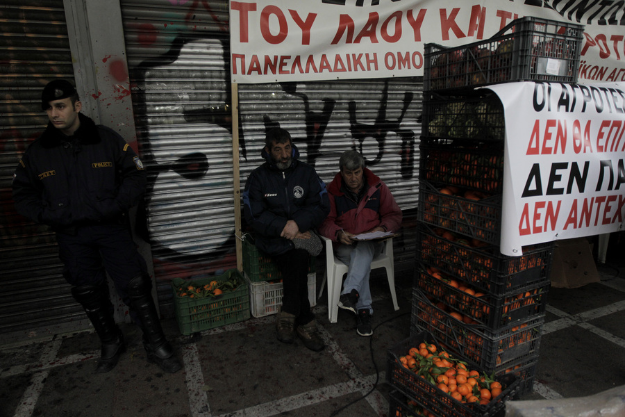 Αγρότες και παραγωγοί έστησαν νωρίτερα μια μικρή λαϊκή αγορά έξω από το υπουργείο Εργασίας.