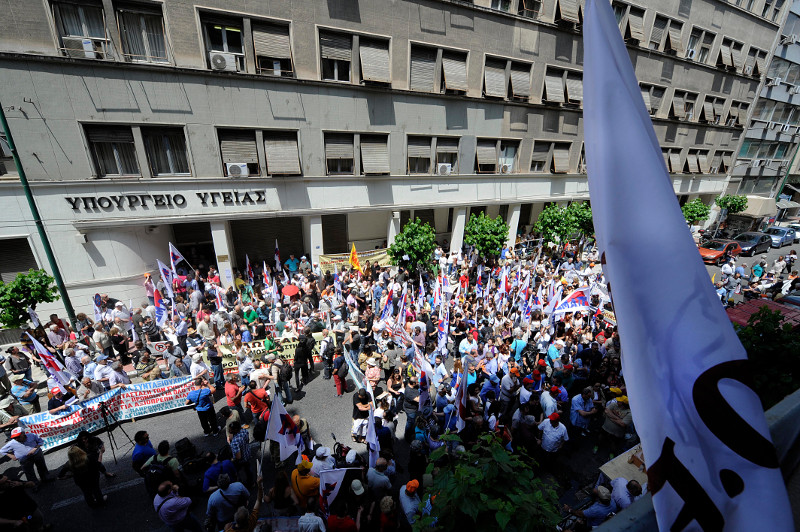 Μαζική ήταν η πορεία διαμαρτυρίας και η διαδήλωση των εργαζομένων στα δημόσια νοσοκομεία και των συνταξιούχων στο υπουργείο Υγείας.