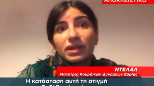 «Θα πολεμήσουμε μέχρι να πεθάνουμε» είναι το μήνυμα των Κούρδων της ΒΑ Συρίας για την τουρκική επιχείρηση Πηγή Ειρήνης μέσω της κούρδισσας μαχήτριας Ντελάλ. H μαχήτρια, που μίλησε στο κεντρικό δελτίο του ΣΚΑΪ και τον Δημήτρη Πανόπουλο κάνει λόγο για απόπειρα εθνοκάθαρσης των Κούρδων από τις τουρκικές δυνάμεις.