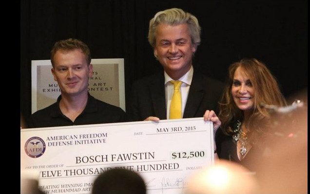 O Bosch Fawstin (αριστερά), ο νικητής του διαγωνισμού σκιτσογραφίας με θέμα τον Μωάμεθ. Δίπλα του ο Βίλντερς του απονέμει το χρηματικό έπαθλο