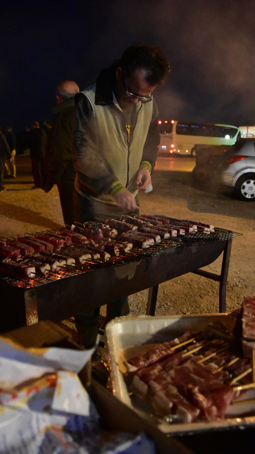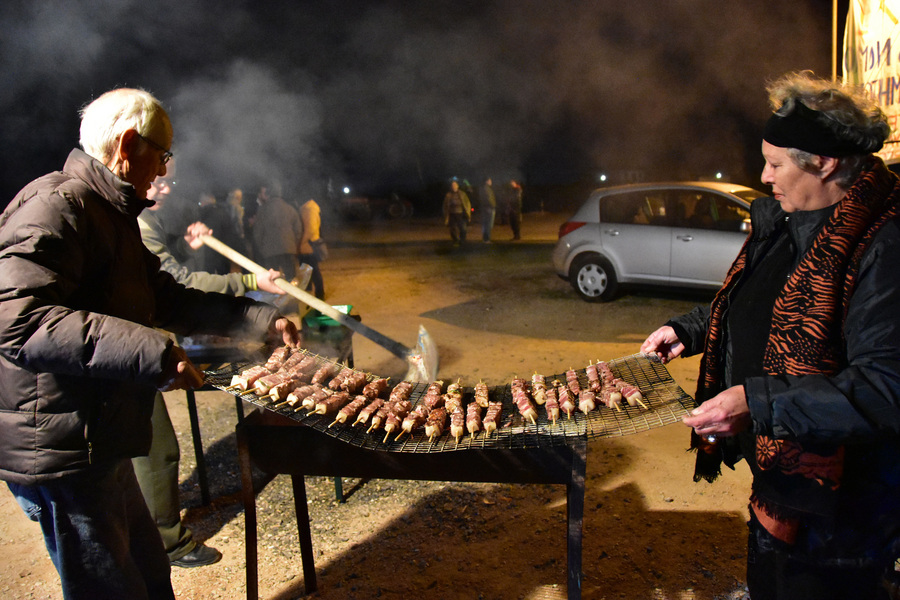Αγρότες ψήνουν σουβλάκια και λουκάνικα στο μπλόκο της Δαλαμανάρας όπου με τα τρακτέρ τους και τα αγροτικά αυτοκίνητα έχουν κλείσει το δρόμο της επαρχιακής οδού Ναυπλίου Άργους στο ύψος της διασταύρωσης για Πυργέλα.