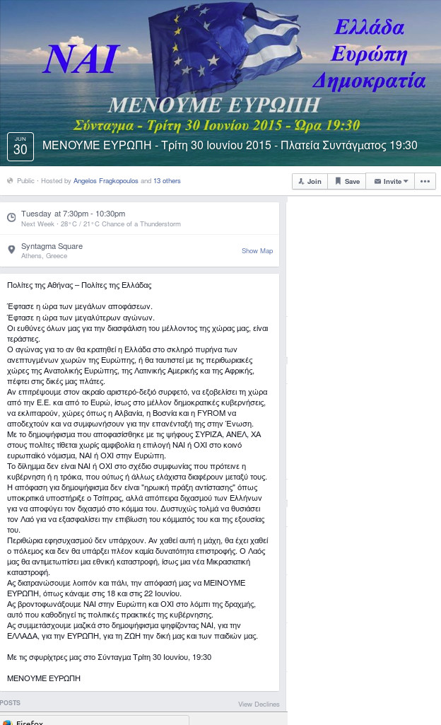 Μέσω facebook έχει ξεκινήσει νέα μεγάλη κινητοποίηση-κάλεσμα στους «Πολίτες της Αθήνας – Πολίτες της Ελλάδας» και τους ζητάει να δώσουν όπως και στις προηγούμενες συγκεντρώσεις βροντερό παρών. «Με τις σφυρίχτρες μας στο Σύνταγμα Τρίτη 30 Ιουνίου, 19:30-ΜΕΝΟΥΜΕ ΕΥΡΩΠΗ»