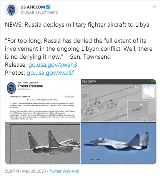 Σύμφωνα με την AFRICOM, τα ρωσικά στρατιωτικά αεροσκάφη είναι πιθανό να παρέχουν στενή αεροπορική υποστήριξη και επιθετικές επιδρομές στους μισθοφόρους της «Wagner Group PMC», που υποστηρίζει τον αγώνα του Λιβυκού Εθνικού Στρατού (LNA) ενάντια στη διεθνώς αναγνωρισμένη κυβέρνηση Εθνικής Συμφωνίας.