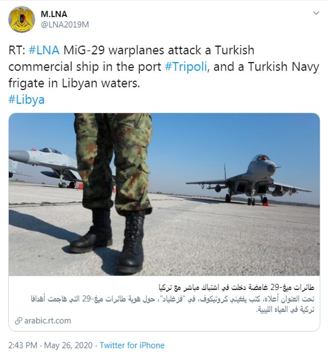 Αεροσκάφη MiG-29, αγνώστου εθνικότητας, μεταδίδεται ότι πραγματοποίησαν αεροπορική επιδρομή ενάντια σε ένα τουρκικό εμπορικό πλοίο και σε μια τουρκική φρεγάτα στα χωρικά ύδατα της Λιβύης, σύμφωνα με την αραβόφωνη ιστοσελίδα του ρωσικού Russia Today.