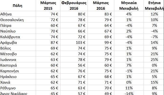 Οι μεταβολές των τιμών των ξενοδοχείων της Ελλάδας μεταβλήθηκαν τόσο αυξητικά, όσο και μειωτικά οδηγώντας τη μέση τιμή στο να διαμορφώνεται στα 84 ευρώ για τον Μάρτιο, 15 τοις εκατό υψηλότερα από τον Μάρτιο του 2015. Στον πίνακα φαίνονται αναλυτικά οι τιμές και οι συγκρίσεις με τον Φεβρουάριο και τον περασμένο μάρτιο.