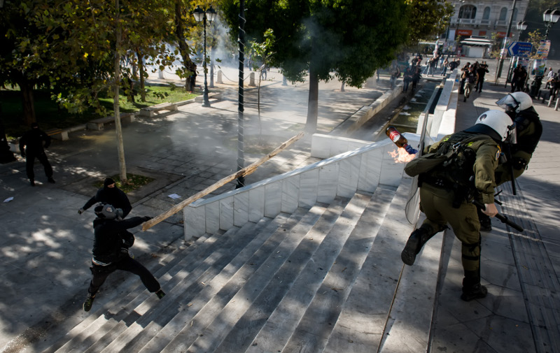 Από το Σύνταγμα, η ένταση μεταφέρθηκε μέσα σε λίγα λεπτά και στη συνέχεια στην Ομόνοια. Κατά το πέρασμα τους οι κουκουλοφόροι έσπασαν στάσεις λεωφορείων, προκάλεσαν ζημιές σε τζαμαρίες υποκαταστημάτων τραπεζών, ενώ έστησαν οδοφράγματα στο δρόμο αναποδογυρίζοντας κάδους σκουπιδιών και βάζοντάς τους φωτιά.Δείτε την επόμενη ή προηγούμενη σελίδα πατώντας τα νούμερα