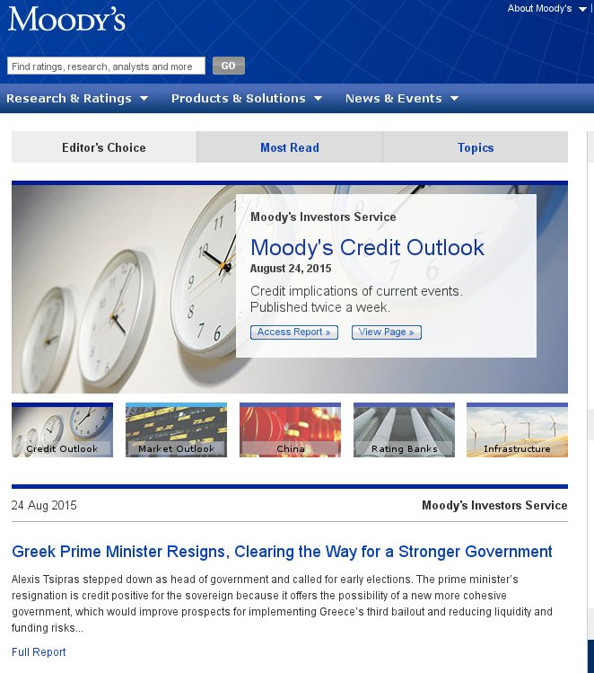 Οπως εκτιμά στην έκθεσή του ο Moody’s «η παραίτηση του πρωθυπουργού είναι θετική για το αξιόχρεο της Ελλάδας, επειδή δίνει τη δυνατότητα μίας πιο συνεκτικής κυβέρνησης, η οποία θα βελτίωνε τις προοπτικές για την εφαρμογή του τρίτου ελληνικού προγράμματος βοήθειας και θα μείωνε τους κινδύνους ρευστότητας και χρηματοδότησης».
