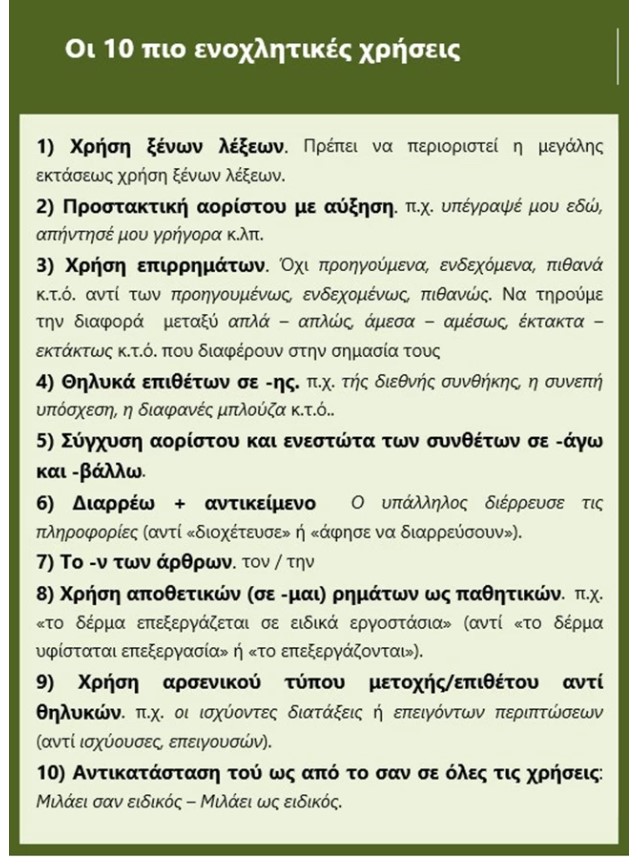 Ζητήθηκε, λοιπόν, από τους τηλεθεατές να επισημάνουν ΤΙΣ ΔΕΚΑ ΠΙΟ ΕΝΟΧΛΗΤΙΚΕΣ ΧΡΗΣΕΙΣ ΤΗΣ ΕΛΛΗΝΙΚΗΣ που μιλάμε και γράφουμε. Τι τους ενοχλεί περισσότερο; Τι νομίζουν ότι δεν έχει καλώς; Τι θεωρούν ότι πρέπει να αλλάξει ή να αποφεύγεται; Υπήρξε πληθώρα απαντήσεων.