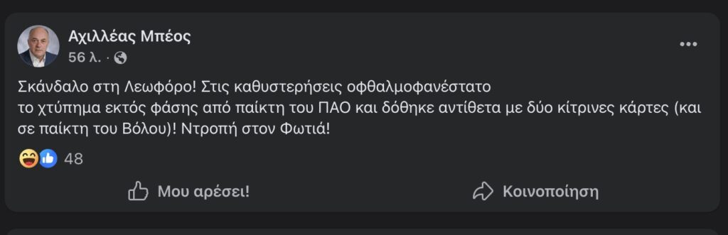 Με μία αιχμηρή ανάρτηση στον προσωπικό του λογαριασμό στο Facebook, ο Αχιλλέας Μπέος έβαλε «φωτιά» στο παιχνίδι της Λεωφόρου, κάνοντας λόγο για κανονικό «σκάνδαλο» εις βάρος της ομάδας του Βόλου.