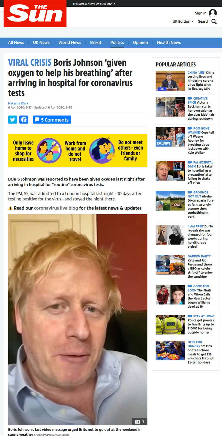 Οξυγόνο χορηγήθηκε στον Βρετανό πρωθυπουργό Μπόρις Τζόνσον, ο οποίος εξακολουθεί να δίνει μάχη με τον κορονοϊό και χθες εισήχθη στο νοσοκομείο «για εξετάσεις ρουτίνας» σχετικά με τον ιό.