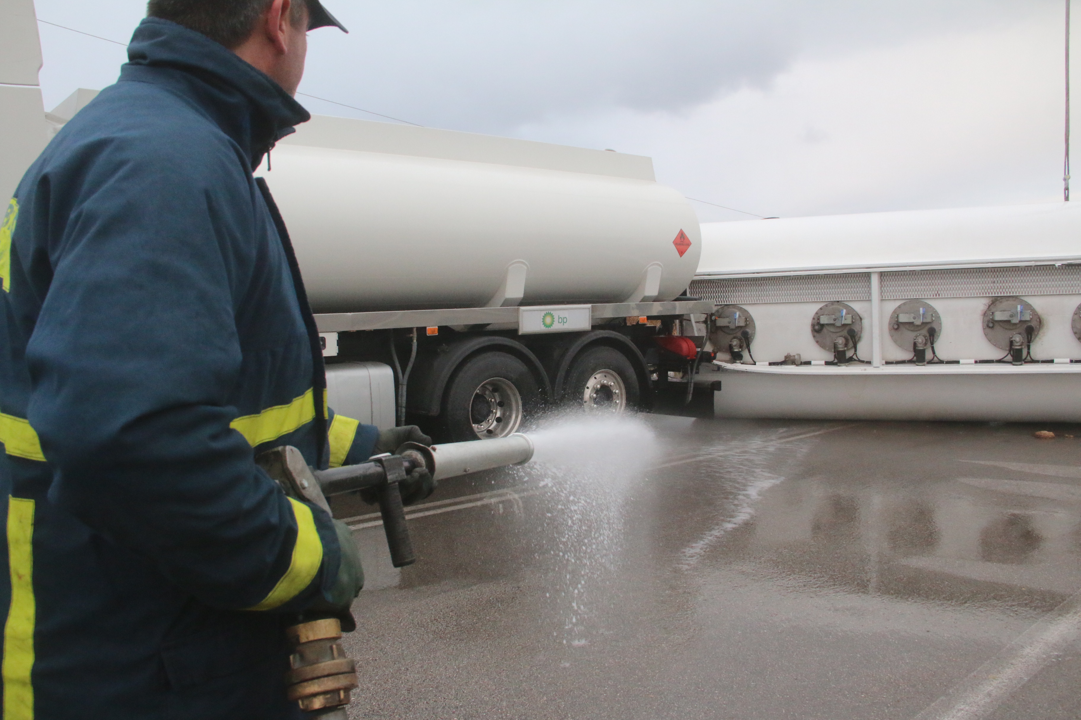 Αμεσα έφτασαν στο σημείο δυνάμεις της αστυνομίας και της Πυροσβεστικής, απέκλεισαν την εθνική οδό και άρχισαν να ρίχνουν ειδικό υγρό, γιατί υπήρχε διαρροή βενζίνης στο οδόστρωμα.