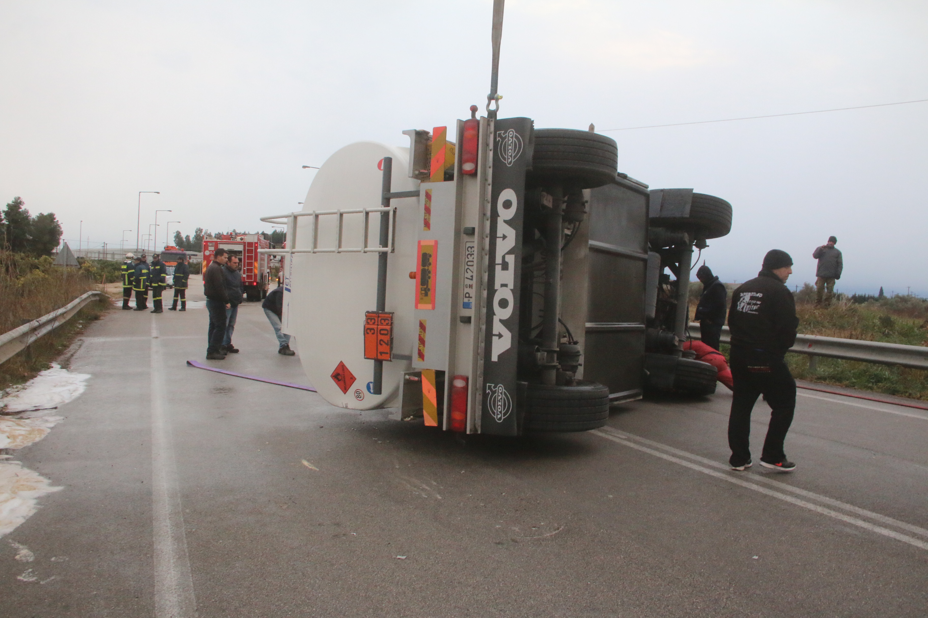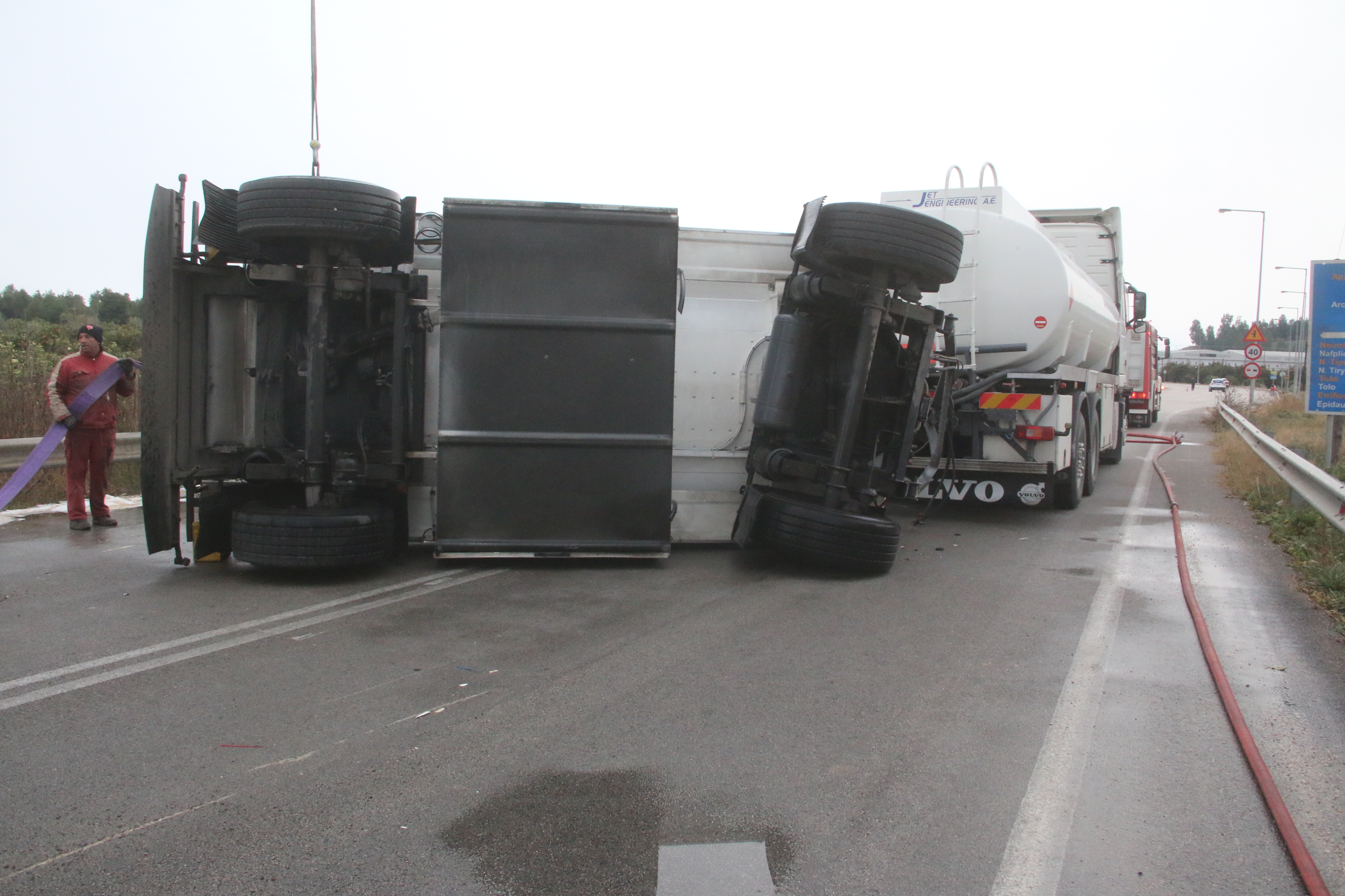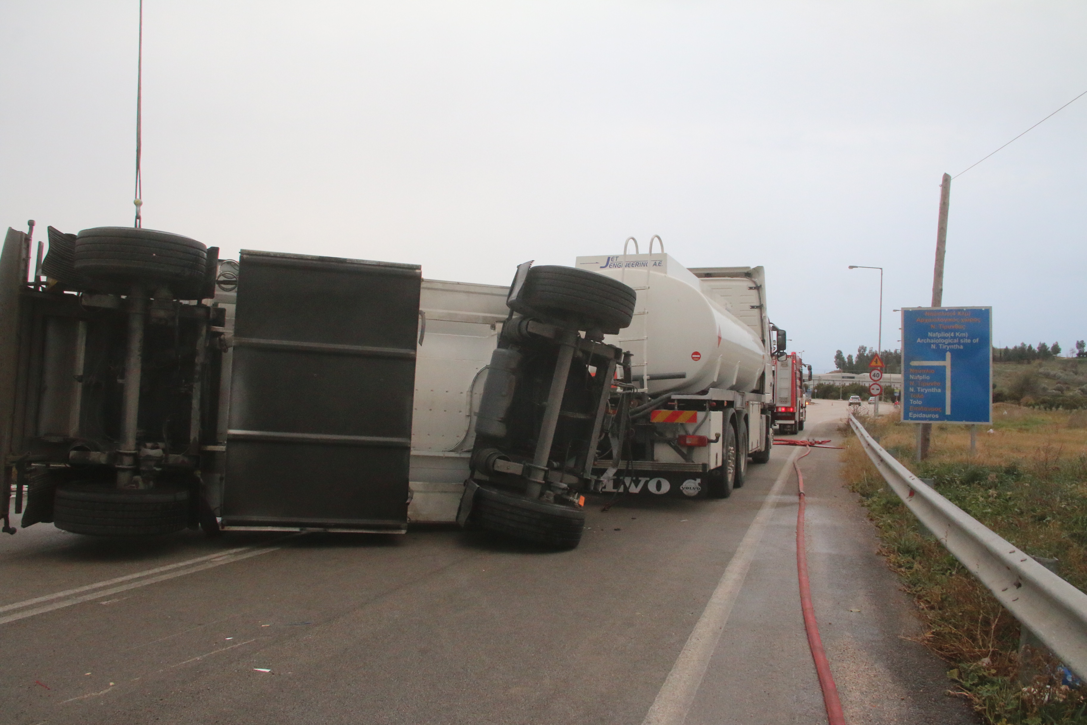Ανατροπή μεγάλου συρόμενο βυτιοφόρου, γεμάτου βενζίνη και πετρέλαιο, στη μέση της εθνικής οδού έγινε λίγο μετά τις δυο το μεσημέρι στο ύψος του κόμβου Αγίας Τριάδας Μιδέας, επί της εθνικής οδού Μυκηνών – Ναυπλίου.