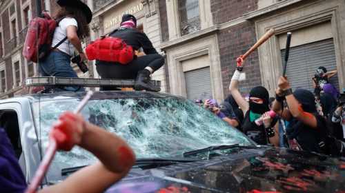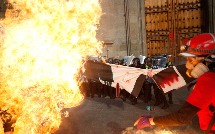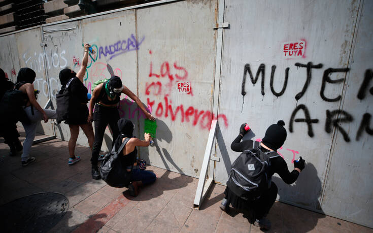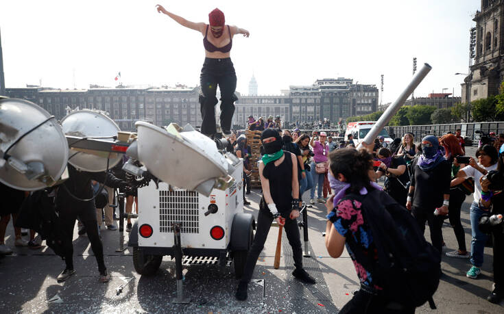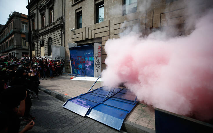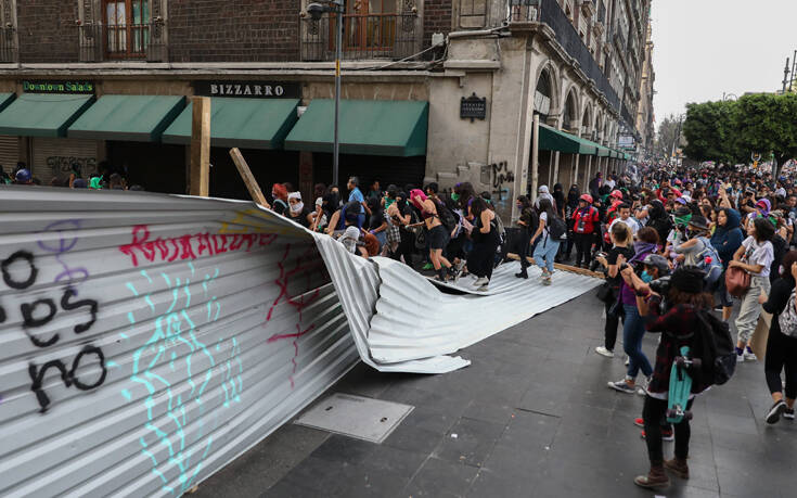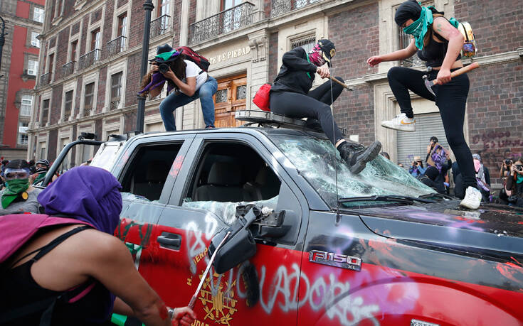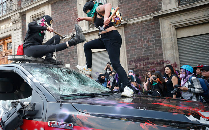Αλλού στο κέντρο της πόλης του Μεξικού γυναίκες με μαύρες μάσκες και οπλισμένες με σφυριά έσπασαν τα τζάμια ενός αυτοκινήτου, αναποδογύρισαν ένα φορτηγάκι και πυρπόλησαν τις πόρτες πολλών κτιρίων.