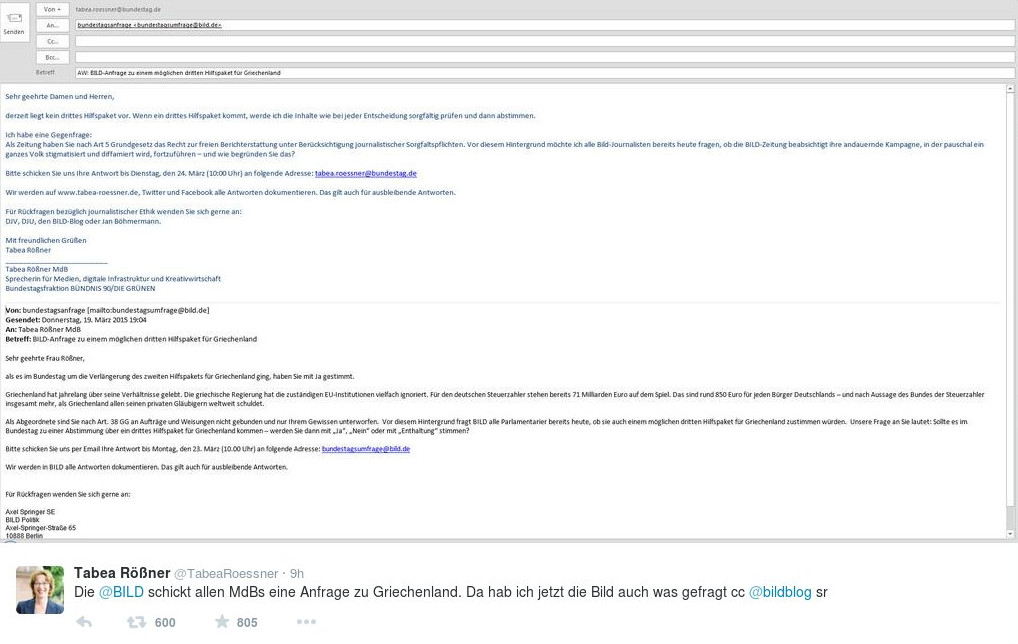 Στην ιστοσελίδα της μάλιστα η βουλευτής ανέδειξε το θέμα: Δημοσίευσε το email της εφημερίδας και χαρακτήρισε την όλη καμπάνια της Bild κατά της Ελλάδας «ανυπόφορη».