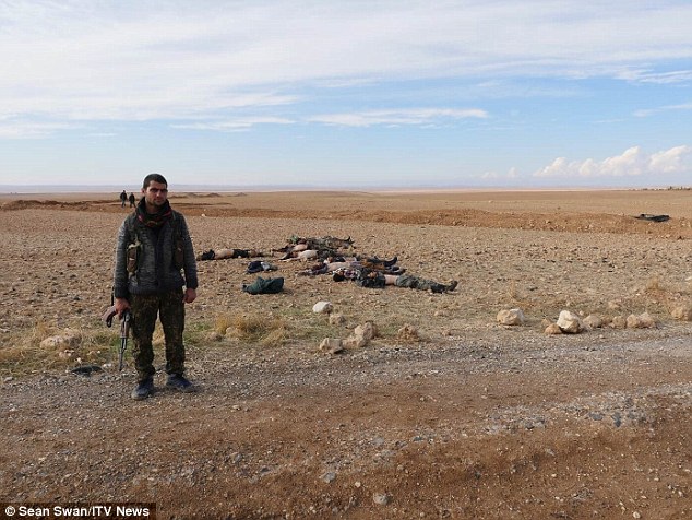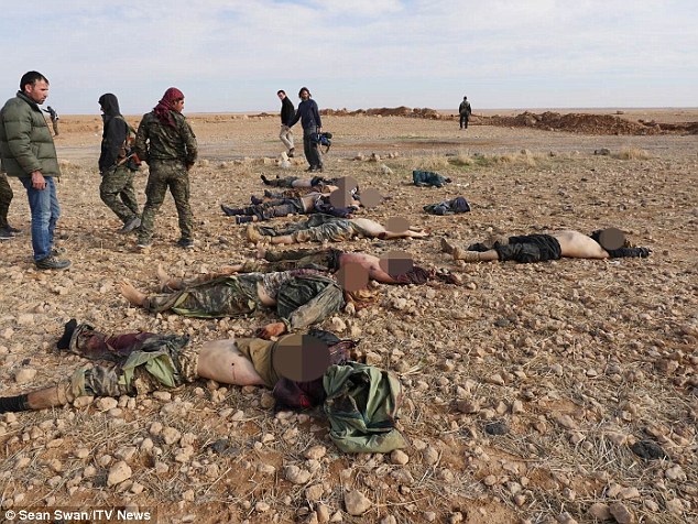 Σε άλλη φωτογραφία 12 τζιχαντιστές κείτονται νεκροί στο έδαφος, μετά από μια επίθεση σε κουρδικό φυλάκιο στο δρόμο από το Κομπάνι στο Εϊν Αλ Αράμπ.