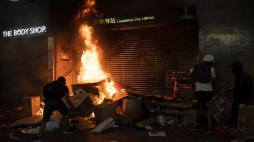 Το βράδυ η αστυνομία χρησιμοποίησε δακρυγόνα για να διαλύσει διαδηλωτές που είχαν γεμίσει τους δρόμους, πέταγαν βόμβες μολότοφ στους αστυνομικούς, έκαψαν την σημαία της Κίνας και βανδάλισαν σταθμούς μετρό και επιχειρήσεις.